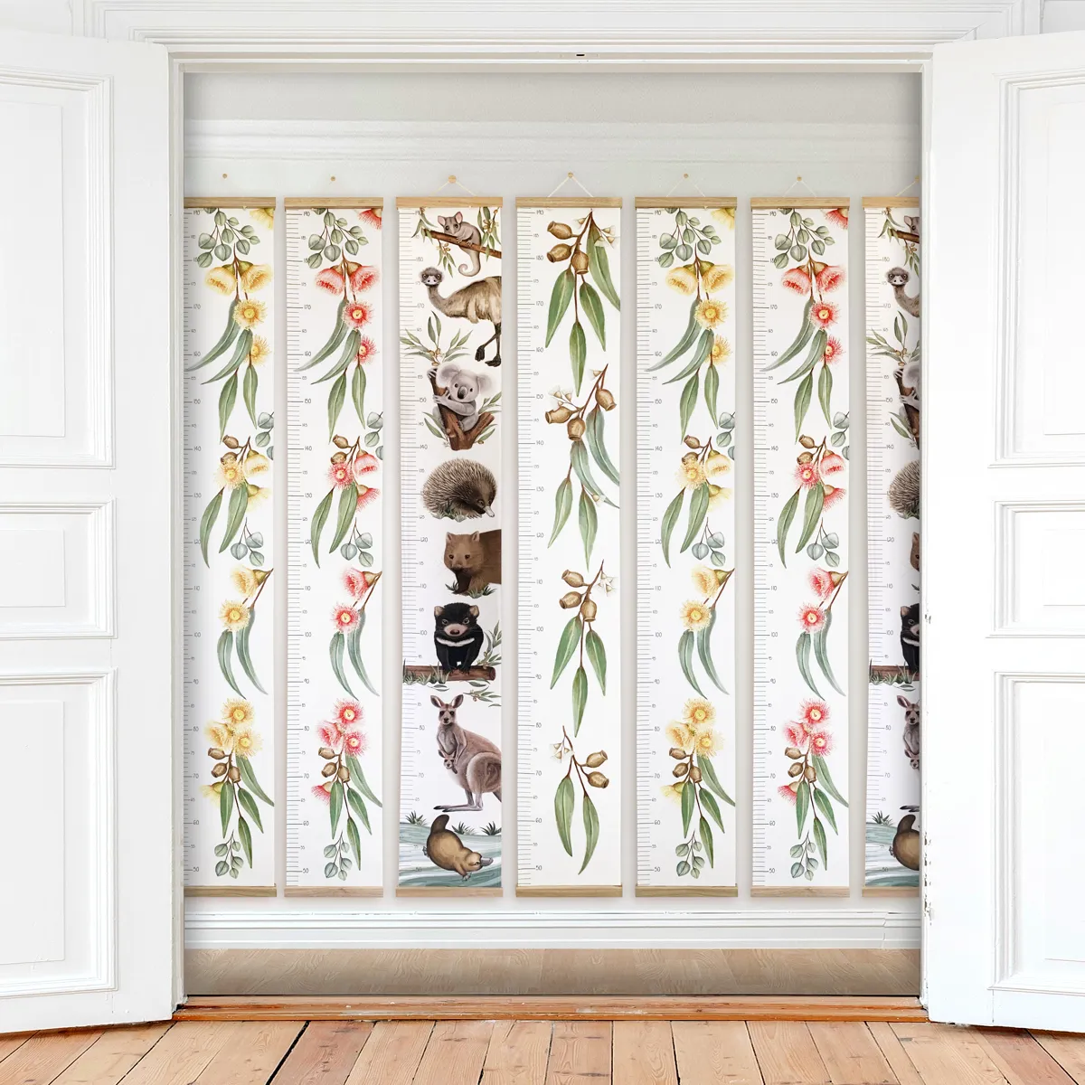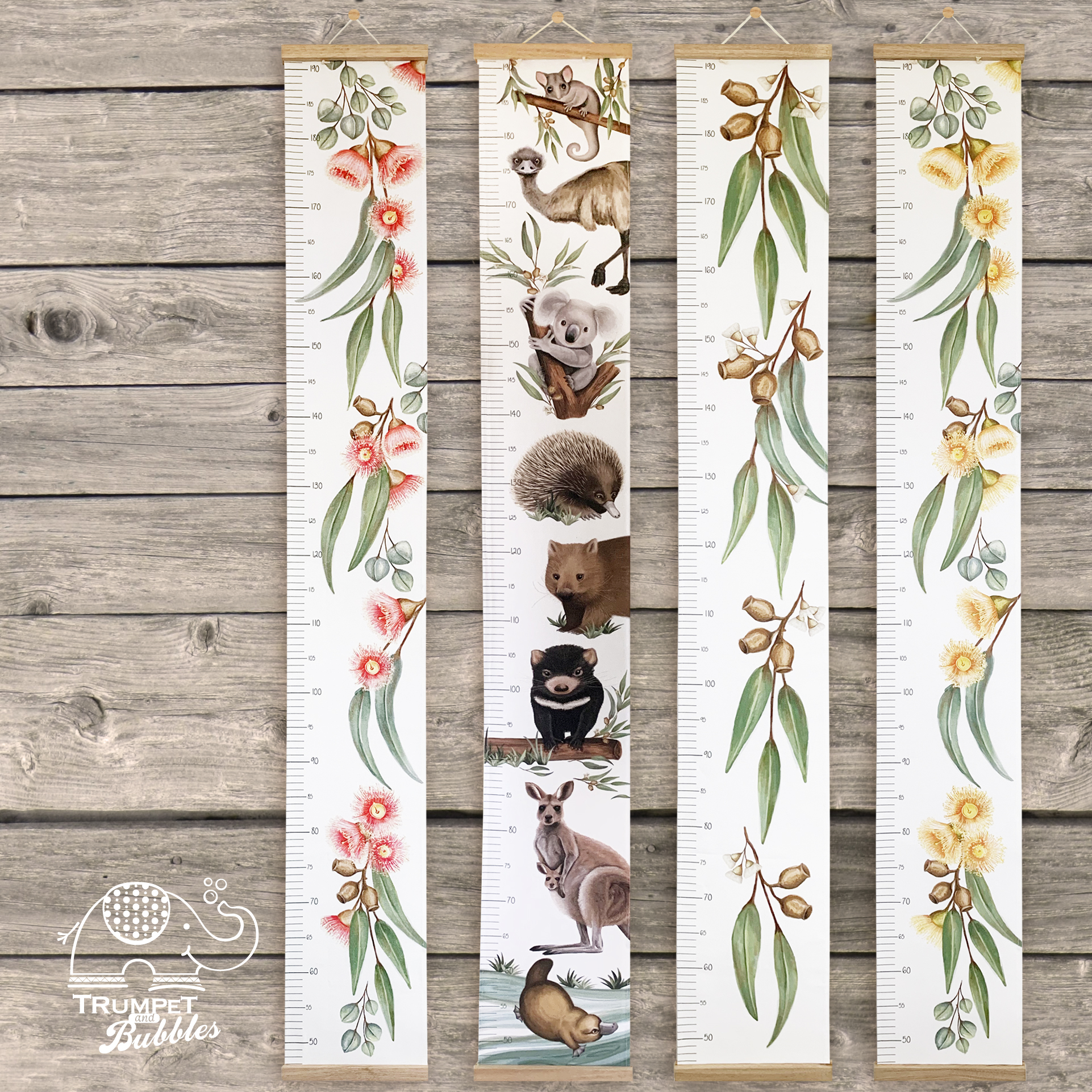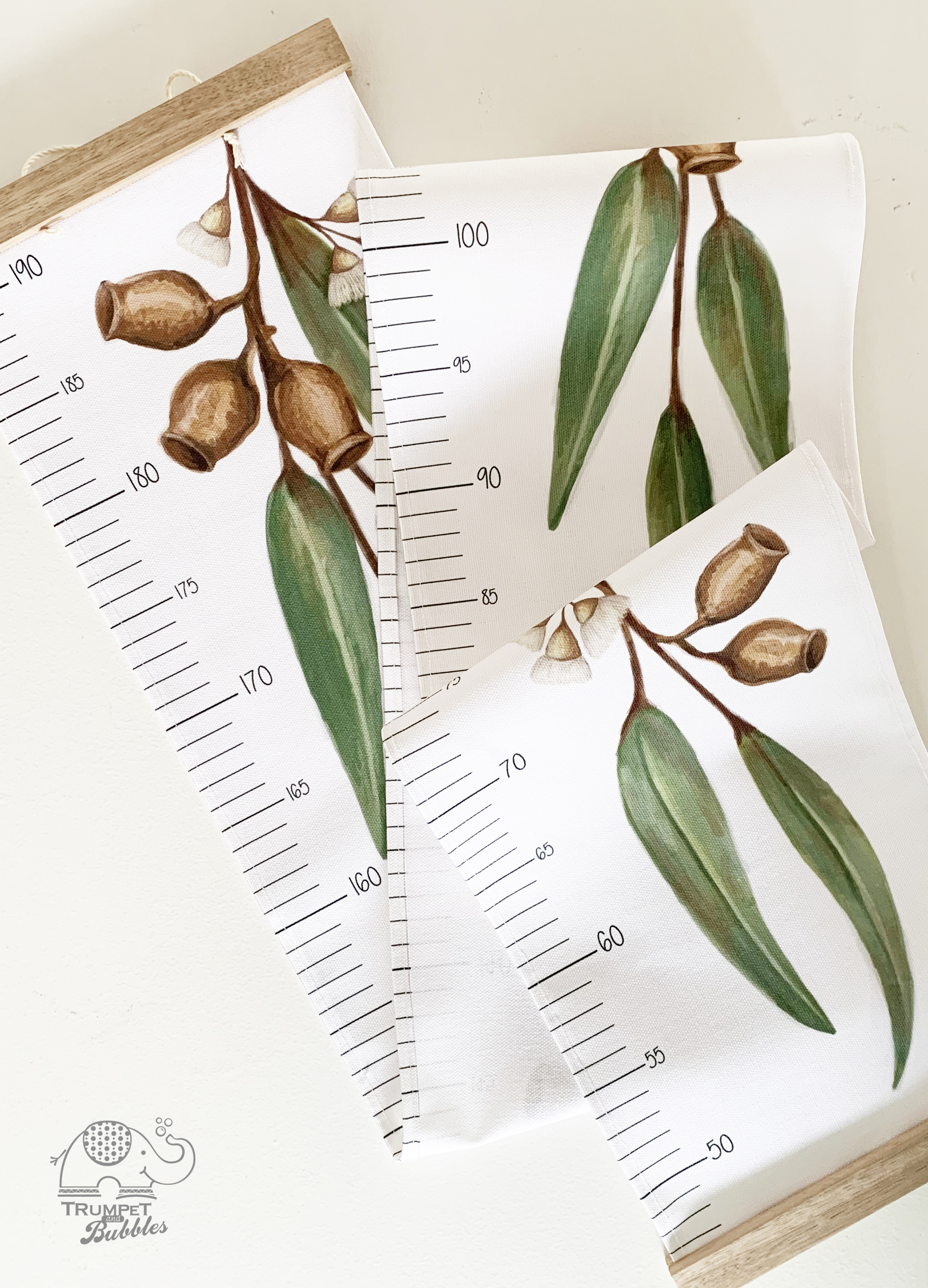 Fabric Height Charts are a beautiful way to decorate your little ones bedroom or play room, while watching them grow. Trumpet & Bubbles Height Charts are made from Organic Cotton Canvas, finished with Tasmanian Oak timber picture hangers top and bottom.