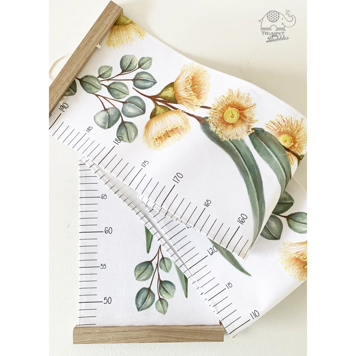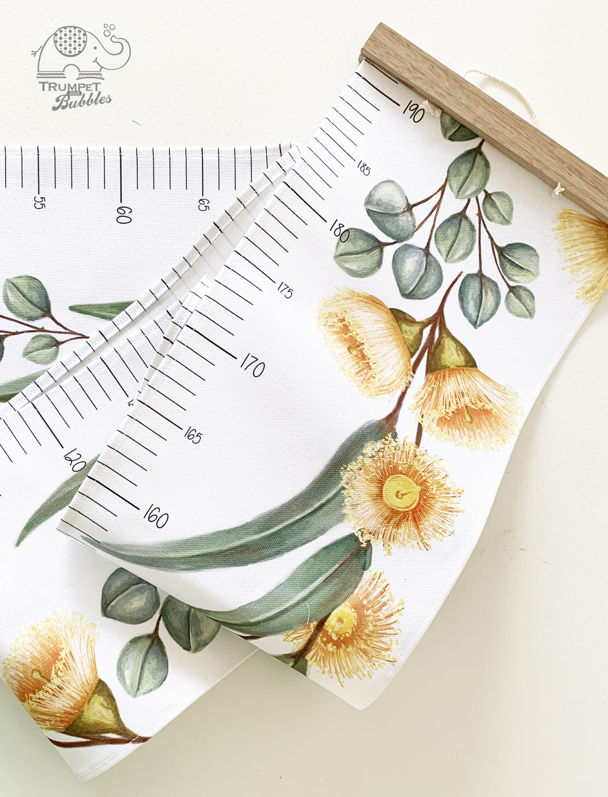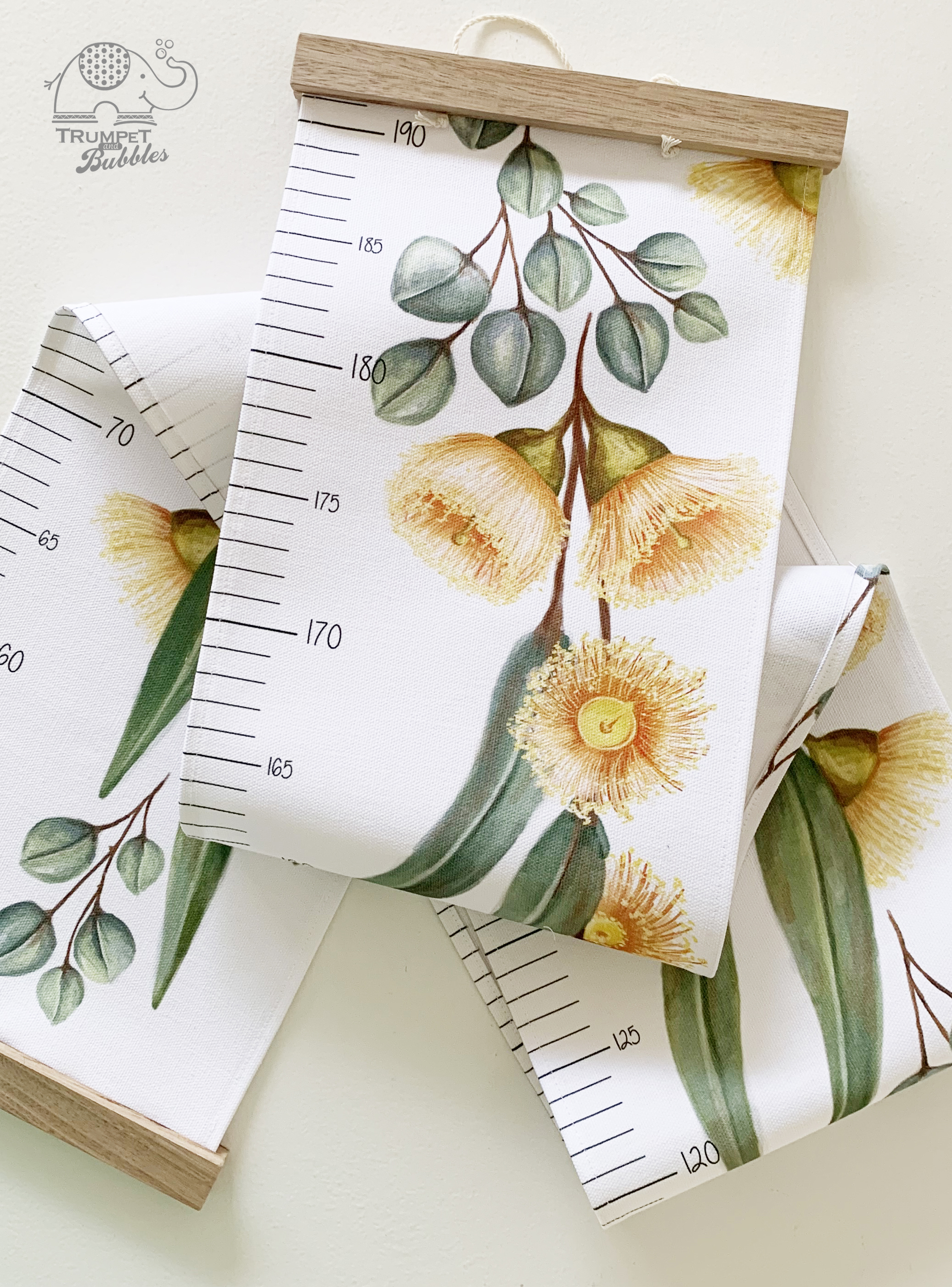 Fabric Height Charts are a beautiful way to decorate your little ones bedroom or play room, while watching them grow. Trumpet & Bubbles Height Charts are made from Organic Cotton Canvas, finished with Tasmanian Oak timber picture hangers top and bottom.